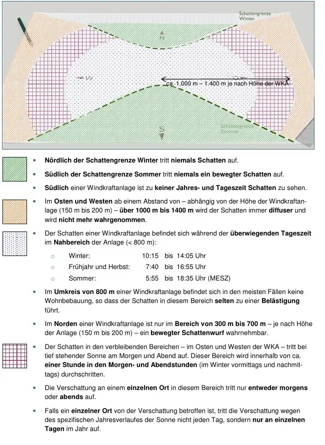 Der Schatten einer 200 Meter-Anlage ist bis 800 Meter Abstand deutlich wahrnehmbar. Im Sommer von 6.00 bis 18.30 Uhr, im Winter von 10.00 bis 14.00 Uhr.