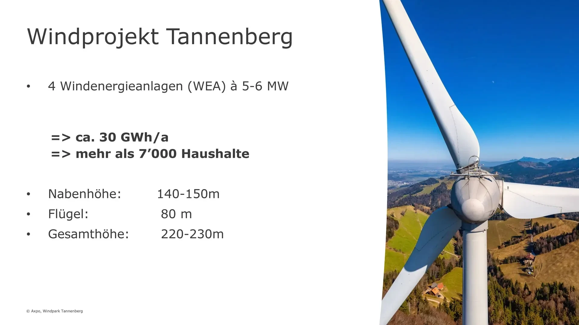 Geplant sind vier Windenergieanlagen von enormer Grösse. Mit einer Leistung von 5 bis 6 Megawatt (MW), einem Mastdurchmesser von rund 7 Metern, einer Nabenhöhe von 150 Metern und einem Rotordurchmesser von 160 Metern weisen sie enorme Dimensionen auf. Die von der Axpo verwendete Abbildung ist nicht massstabsgetreu und zeigt fälschlicherweise einen deutlich kleineren Anlagentyp. Zum Vergleich: Die geplanten Anlagen sind wesentlich grösser als die bekannte Anlage bei Chur, die bei einer Leistung von 3 MW einen Mastdurchmesser von etwa 3 Metern, eine Nabenhöhe von 119 Metern und einen Rotordurchmesser von 112 Metern aufweist.