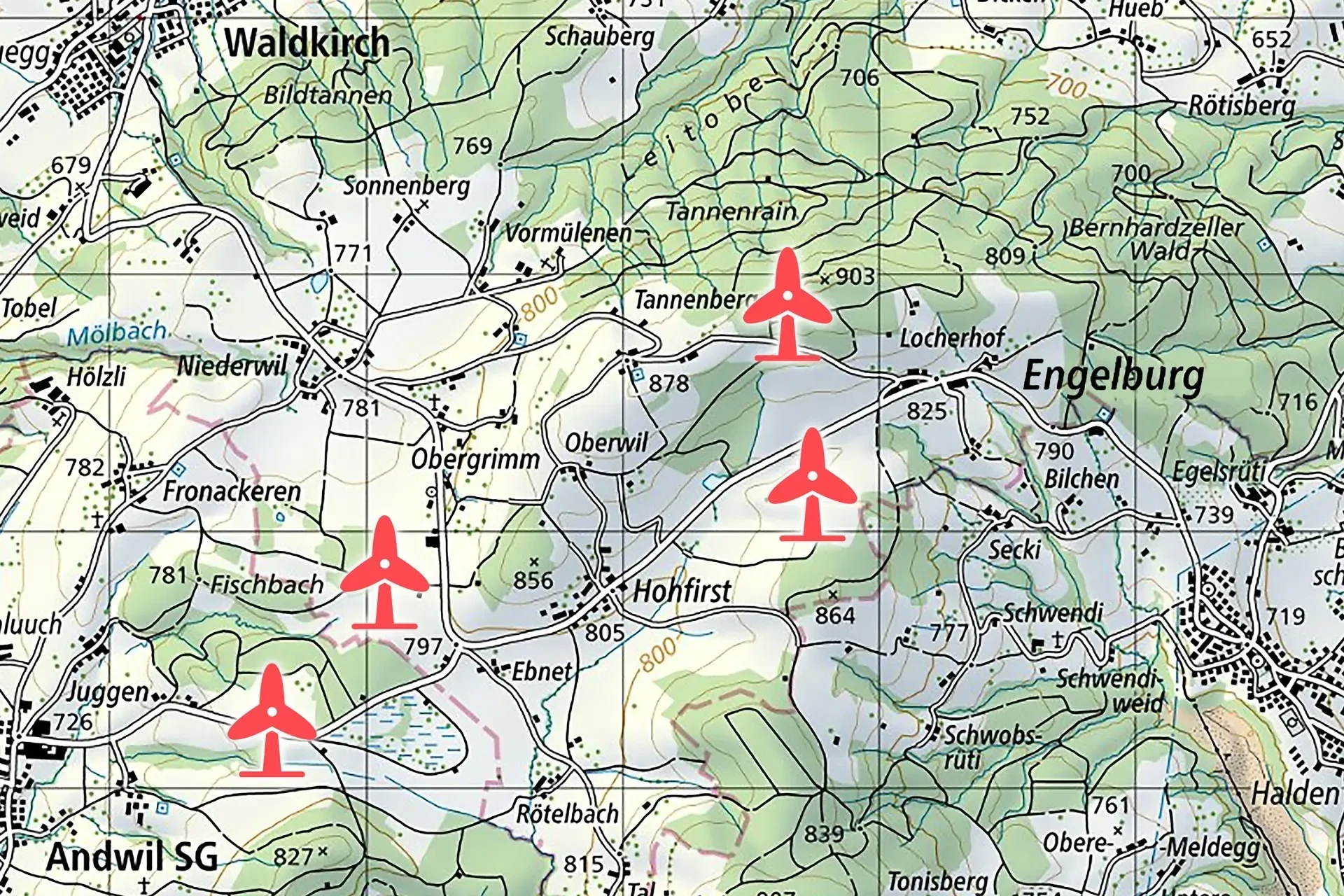 Die vier Anlagen weisen eine Höhe von 230 Metern auf und stehen auf Fundamenten mit über 25 Metern Durchmesser und rund 4 Metern Tiefe. Dazu braucht es breite Erschliessungsstrassen für 40-Tönner, welche für den Unterhalt bestehen bleiben. Das sind unmenschliche Dimensionen und eine Zerstörung der Landschaft.