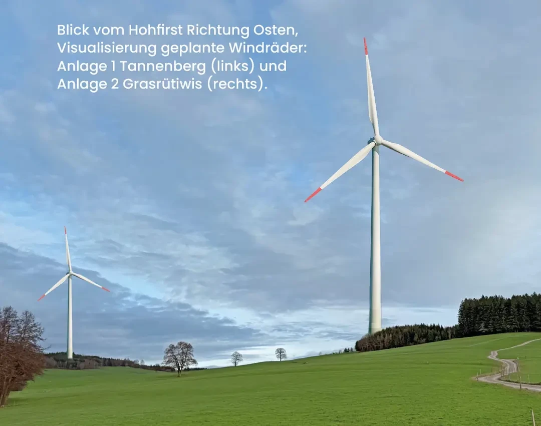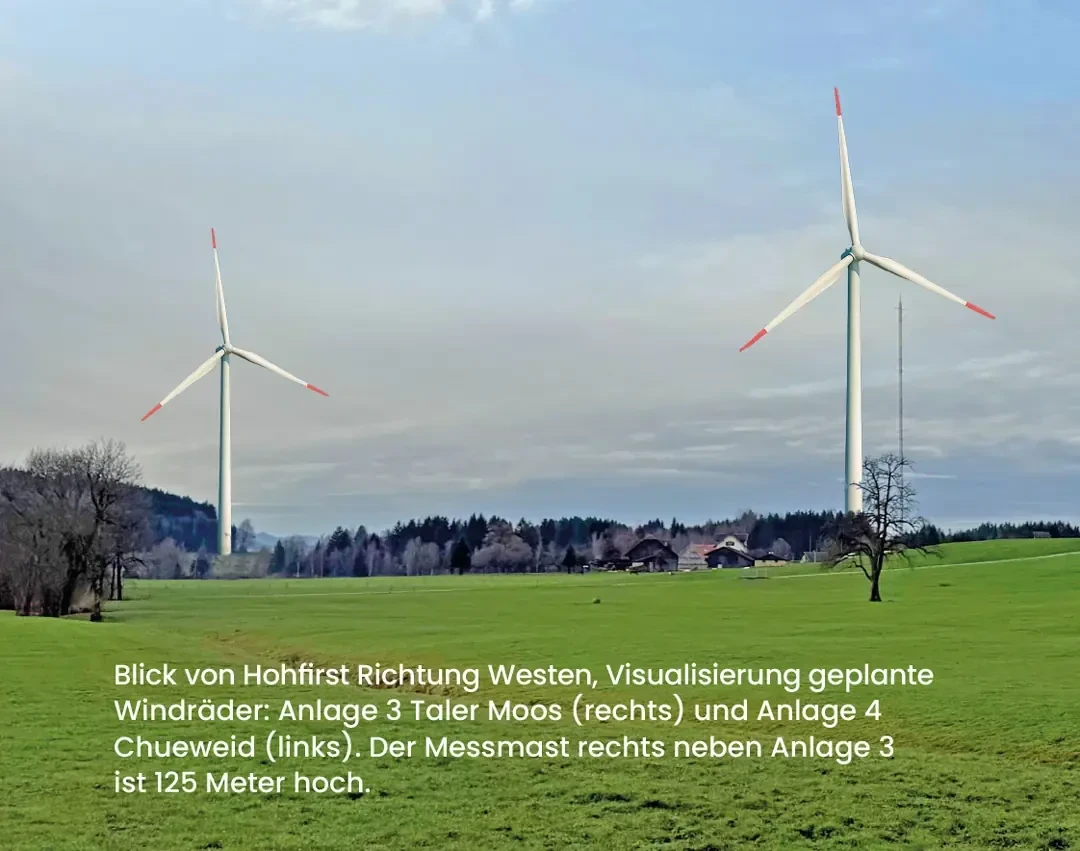 Die abgebildeten Visualisierungen machen die Grössenverhältnisse deutlicher klar. Sie zeigen auch, wie sich das Landschaftsbild drastisch verändern würde, sollten diese Windkraftwerke gebaut werden.