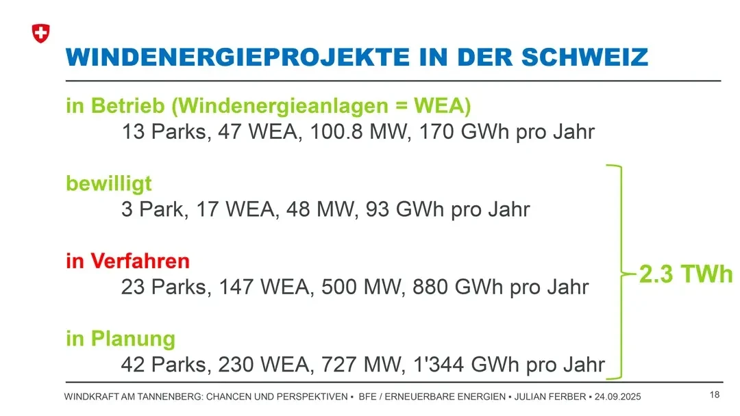 Gemäss Bundesamt für Energie (BFE) würden die heute angedachten, möglichen 394 Anlagen 2.3 Terrawattstunden produzieren. Das wäre rund 1% des Gesamtenergiebedarfs (inkl. Fossile, welche ja auch ersetzt werden sollten). Der Windatlas zeigt, dass die Windgeschwindigkeiten und Windhäufigkeit in der Schweiz an erstellungszugänglichen Standorten ungenügend sind.